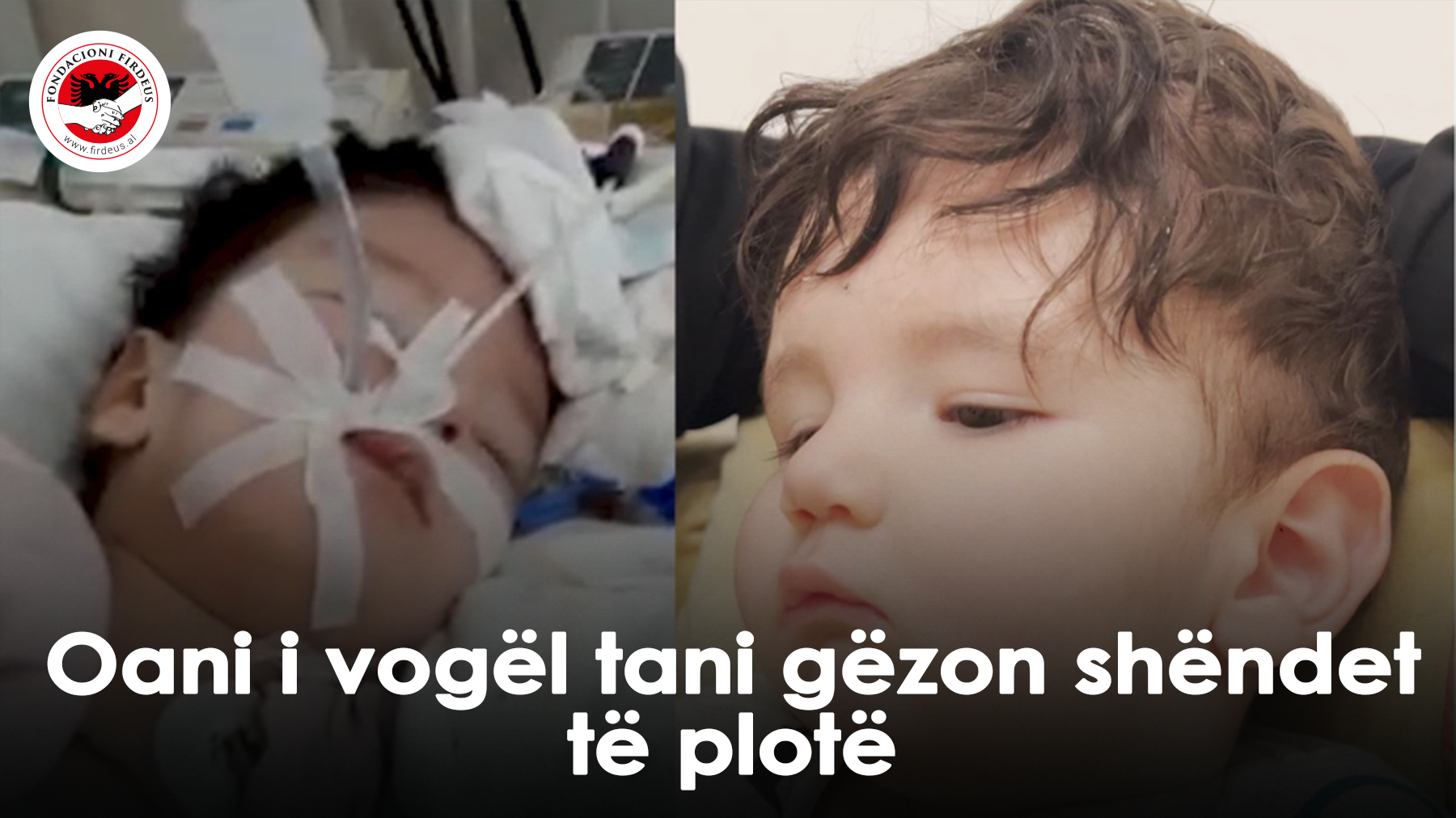 Para pak kohësh Fondacioni Firdeus mori përsipër rastin e Oanit të vogël i cili ishte i intubuar . Shqiptarët u bënë bashkë dhe mblodhën shumën që duhej për shërimin e Oanit . Tashmë Oani gëzon shëndet të plotë dhe duket më së miri .